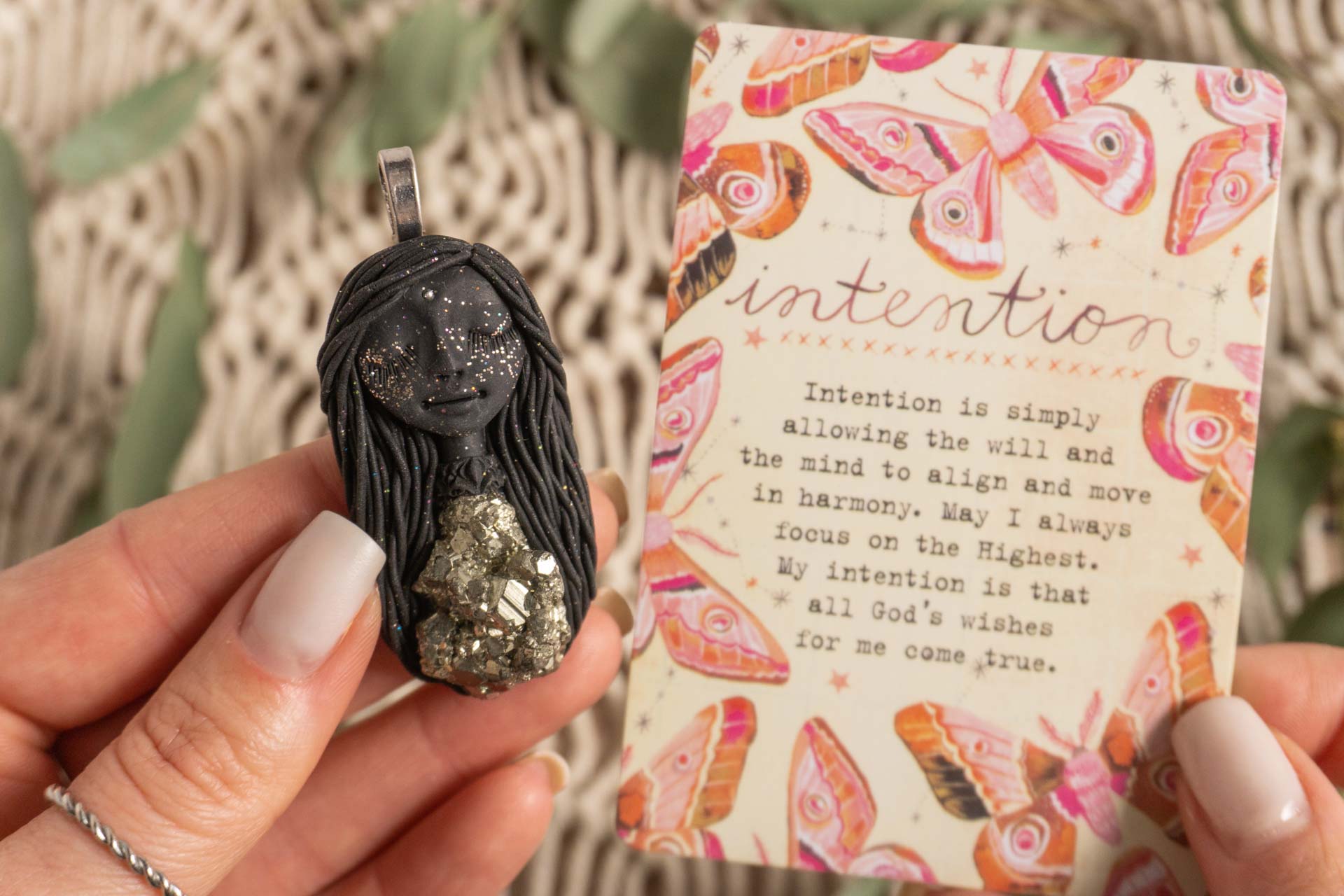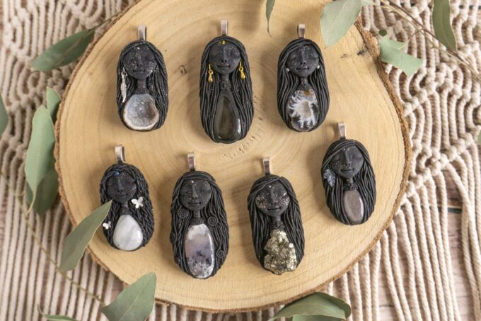 Vsaka Čarobnica je poimenovana po boginjah iz različnih obdobij, kultur in tradicij z vseh koncev sveta. Med izdelavo za vsako Čarobnico posebej povlečem orakelsko karto, ki nosi posebno sporočilo. Z vsako Čarobnico dobite torej še sporočilo, ki ga odkrijete šele, ko odprete paketek.