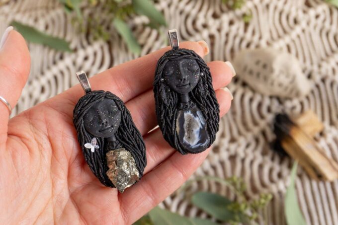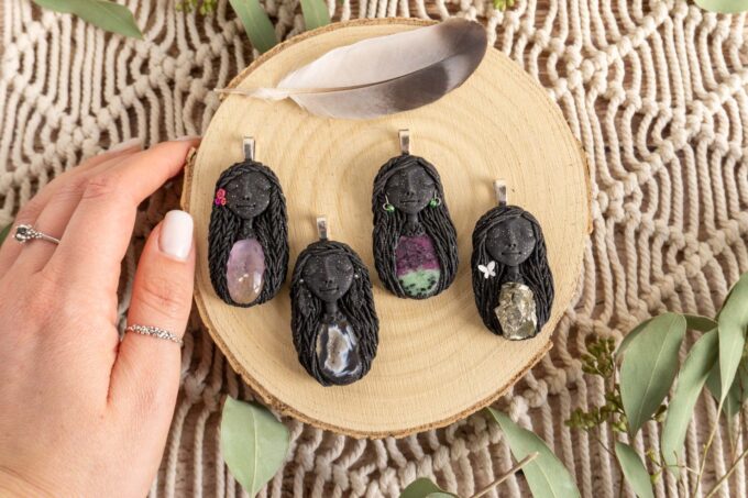 Vsaka Čarobnica je poimenovana po boginjah iz različnih obdobij, kultur in tradicij z vseh koncev sveta. Med izdelavo za vsako Čarobnico posebej povlečem orakelsko karto, ki nosi posebno sporočilo. Z vsako Čarobnico dobite torej še sporočilo, ki ga odkrijete šele, ko odprete paketek.