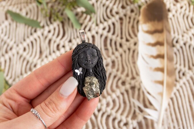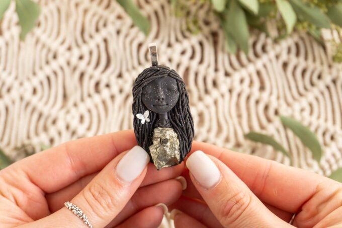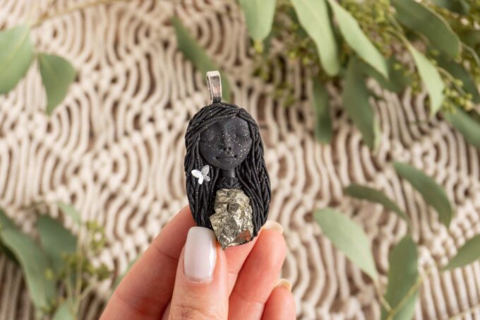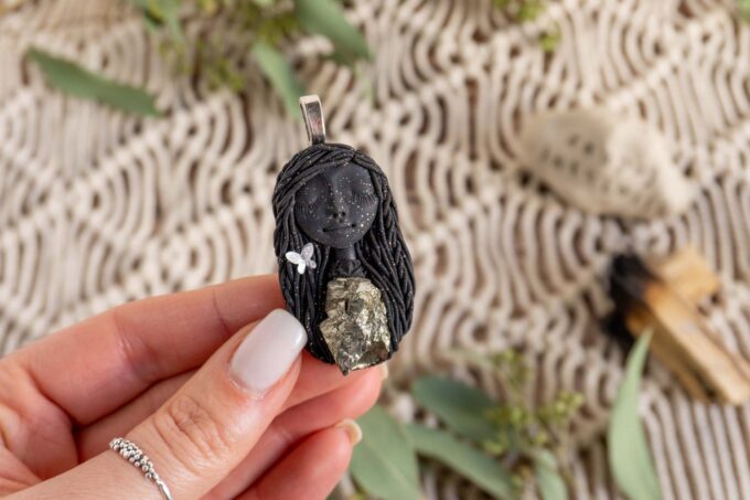 Čarobnica je izdelana iz polimerne gline. Vsak kos je unikaten in na voljo samo en kos. Izdelek lahko minimalno odstopa v barvnih niansah in detajlih, vendar se trudim, da bo vaš izdelek v naravi identičen opisu in fotografiji.