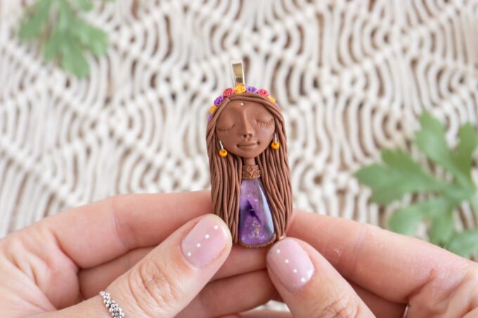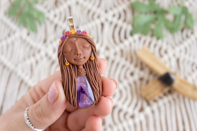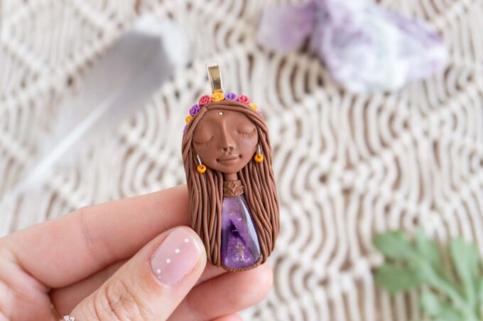 Čarobnica je izdelana iz polimerne gline. Vsak kos je unikaten in na voljo samo en kos. Izdelek lahko minimalno odstopa v barvnih niansah in detajlih, vendar se trudim, da bo vaš izdelek v naravi identičen opisu in fotografiji.