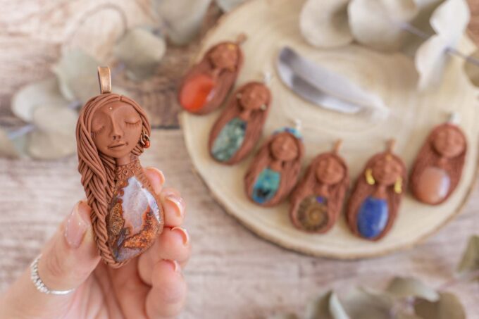 Vsaka Čarobnica je poimenovana po boginjah iz različnih obdobij, kultur in tradicij z vseh koncev sveta. Med izdelavo za vsako Čarobnico posebej povlečem orakelsko karto, ki nosi posebno sporočilo. Z vsako Čarobnico dobite torej še sporočilo, ki ga odkrijete šele, ko odprete paketek.