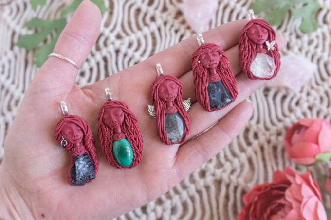 Vsaka Čarobnica je poimenovana po boginjah iz različnih obdobij, kultur in tradicij z vseh koncev sveta. Med izdelavo za vsako Čarobnico posebej povlečem orakelsko karto, ki nosi posebno sporočilo. Z vsako Čarobnico dobite torej še sporočilo, ki ga odkrijete šele, ko odprete paketek.