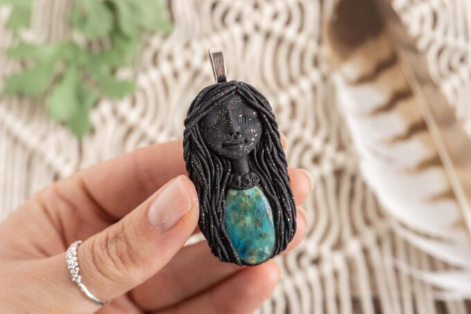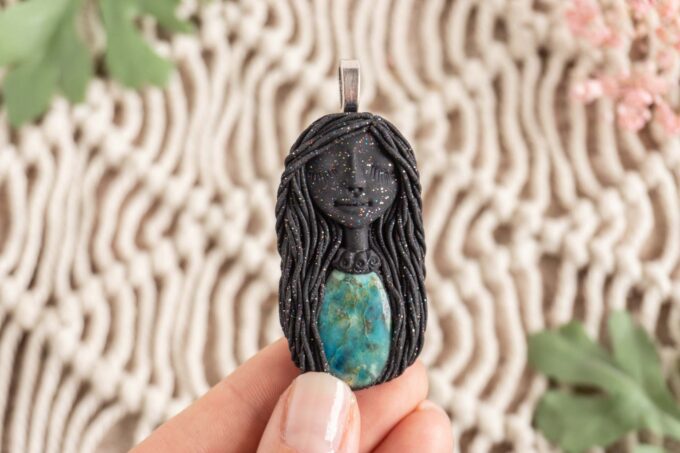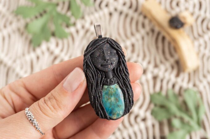 Čarobnica je izdelana iz polimerne gline. Vsak kos je unikaten in na voljo samo en kos. Izdelek lahko minimalno odstopa v barvnih niansah in detajlih, vendar se trudim, da bo vaš izdelek v naravi identičen opisu in fotografiji.