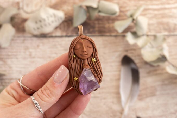 Čarobnica je izdelana iz polimerne gline. Vsak kos je unikaten in na voljo samo en kos. Izdelek lahko minimalno odstopa v barvnih niansah in detajlih, vendar se trudim, da bo vaš izdelek v naravi identičen opisu in fotografiji.