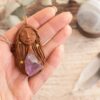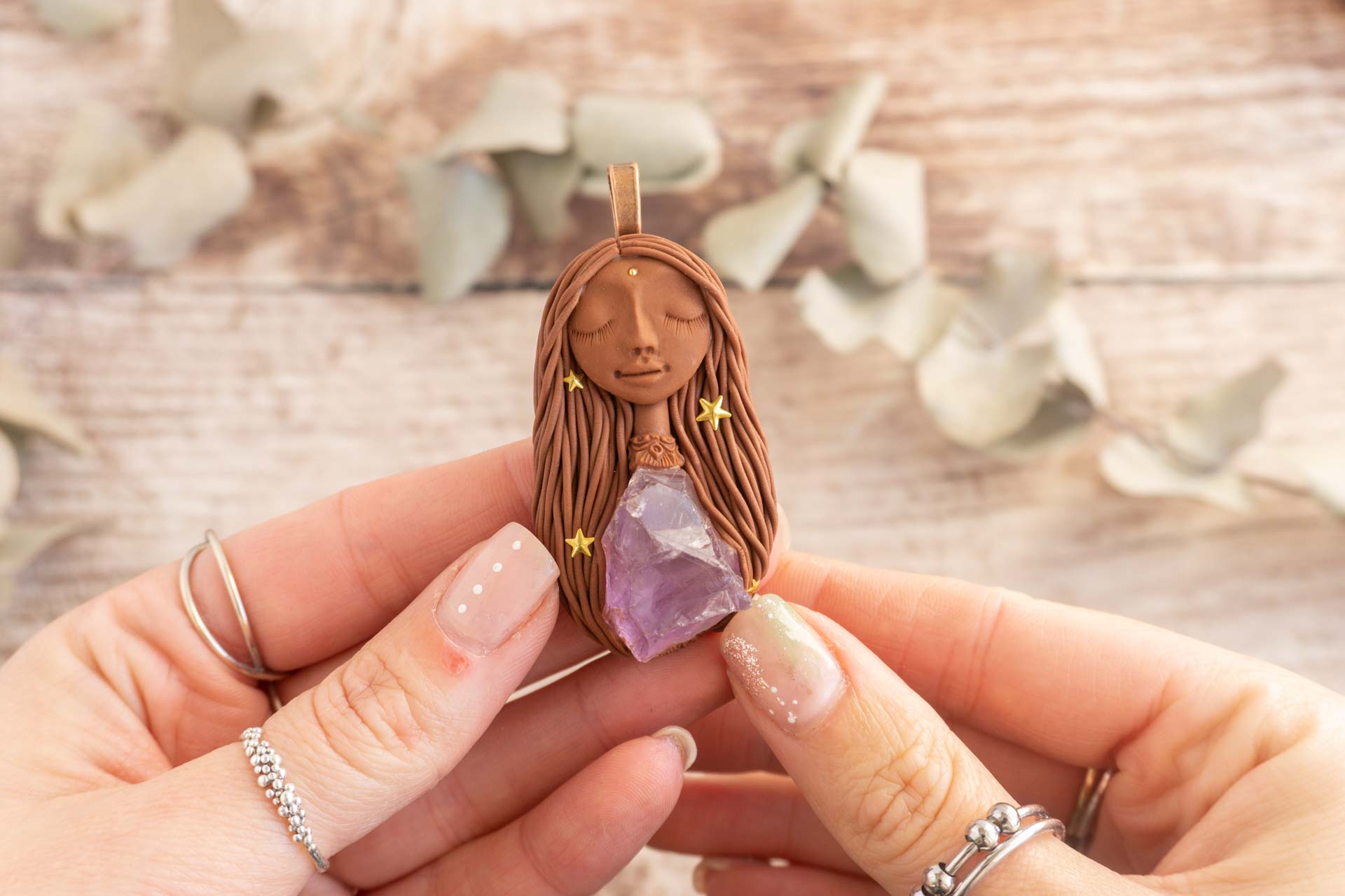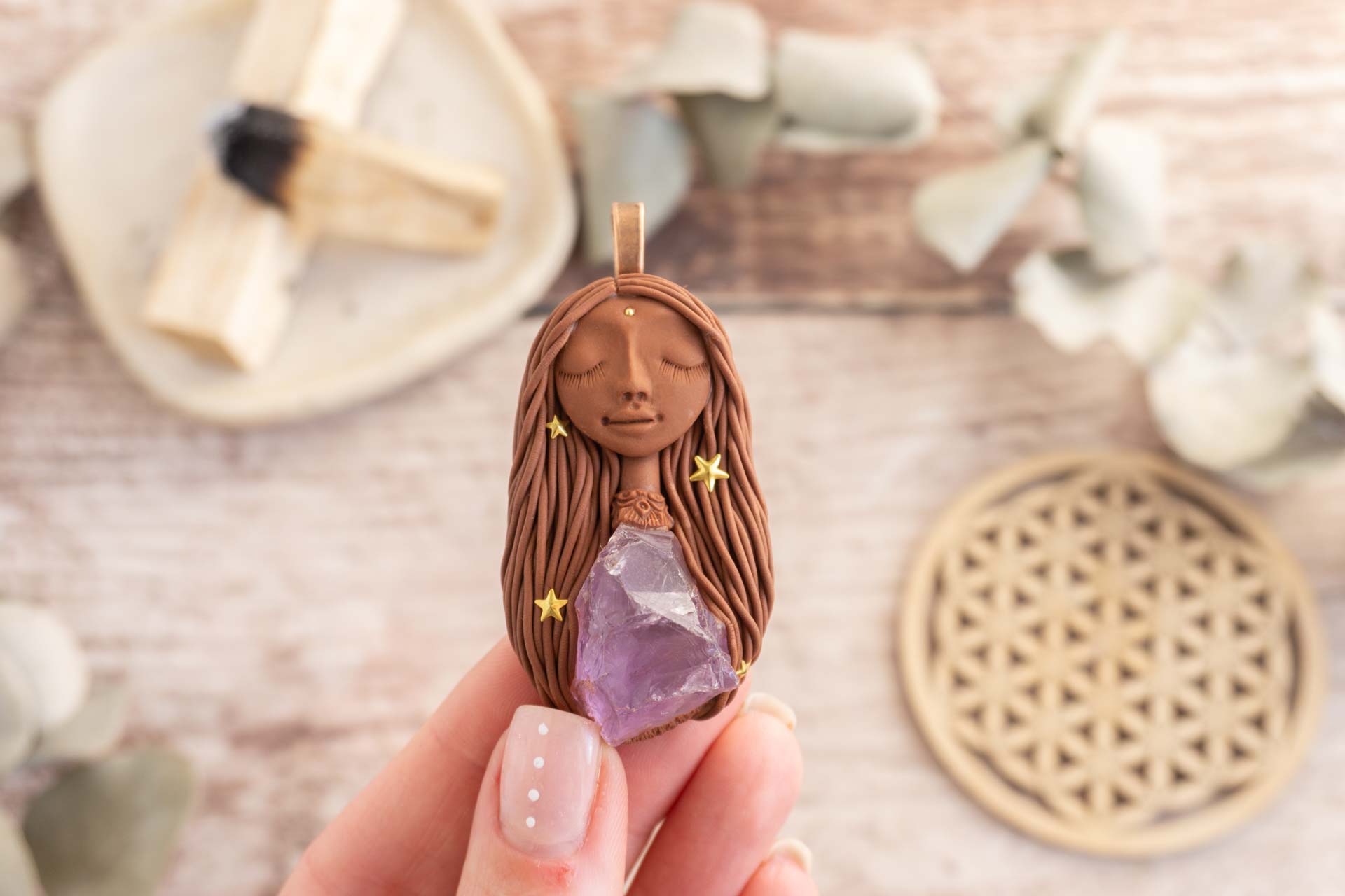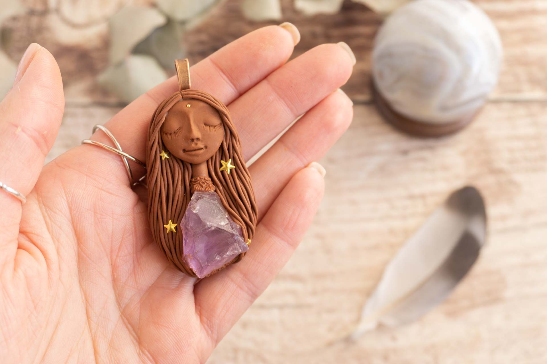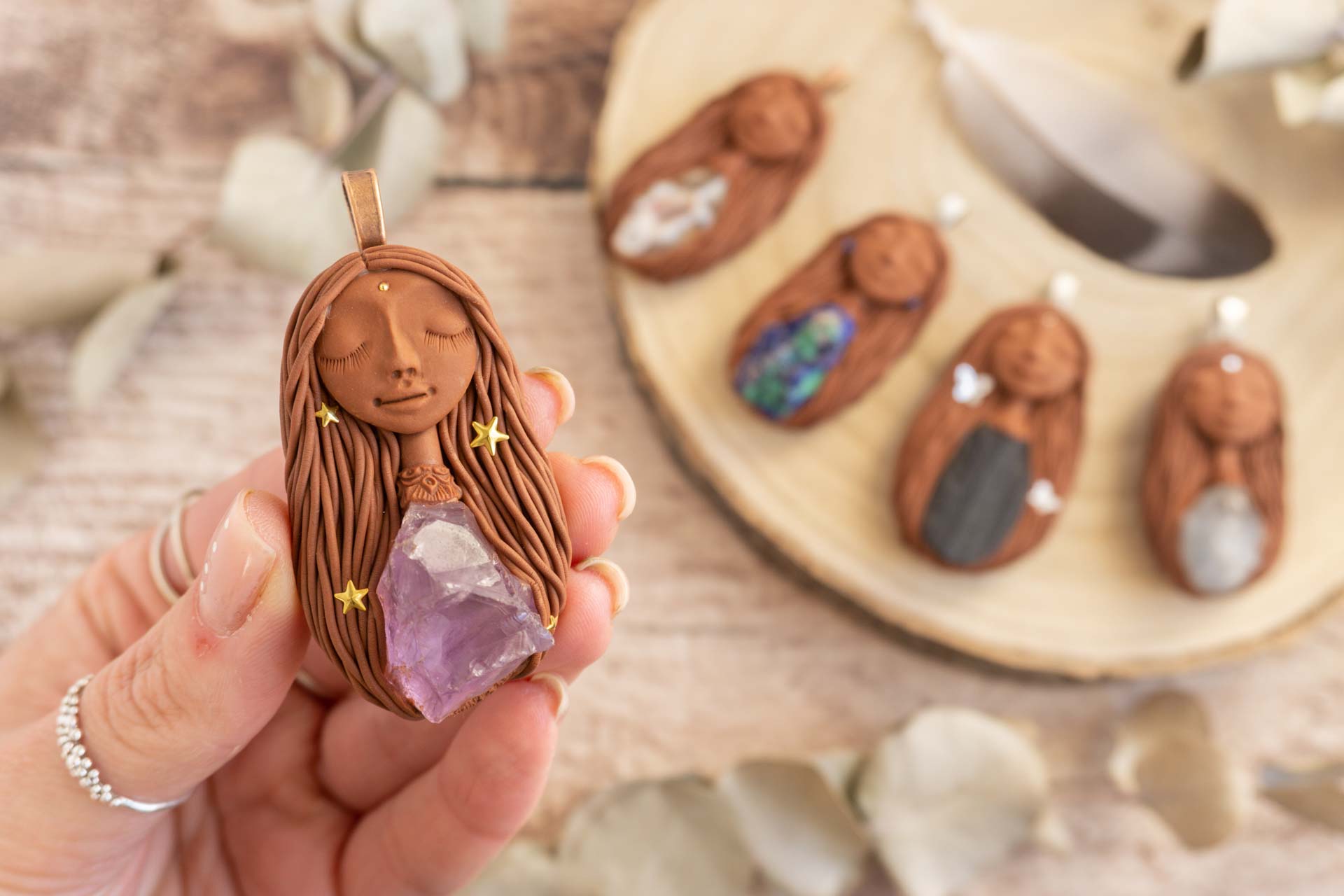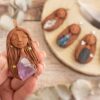 Vsaka Čarobnica je poimenovana po boginjah iz različnih obdobij, kultur in tradicij z vseh koncev sveta. Med izdelavo za vsako Čarobnico posebej povlečem orakelsko karto, ki nosi posebno sporočilo. Z vsako Čarobnico dobite torej še sporočilo, ki ga odkrijete šele, ko odprete paketek.