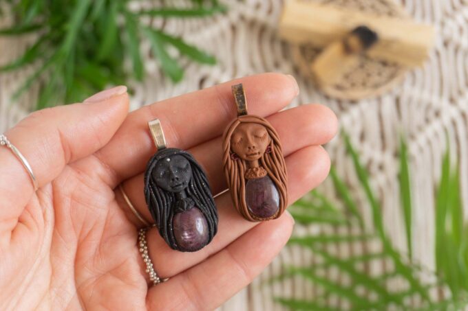 Vsaka Čarobnica je poimenovana po boginjah iz različnih obdobij, kultur in tradicij z vseh koncev sveta. Med izdelavo za vsako Čarobnico posebej povlečem orakelsko karto, ki nosi posebno sporočilo. Z vsako Čarobnico dobite torej še sporočilo, ki ga odkrijete šele, ko odprete paketek.