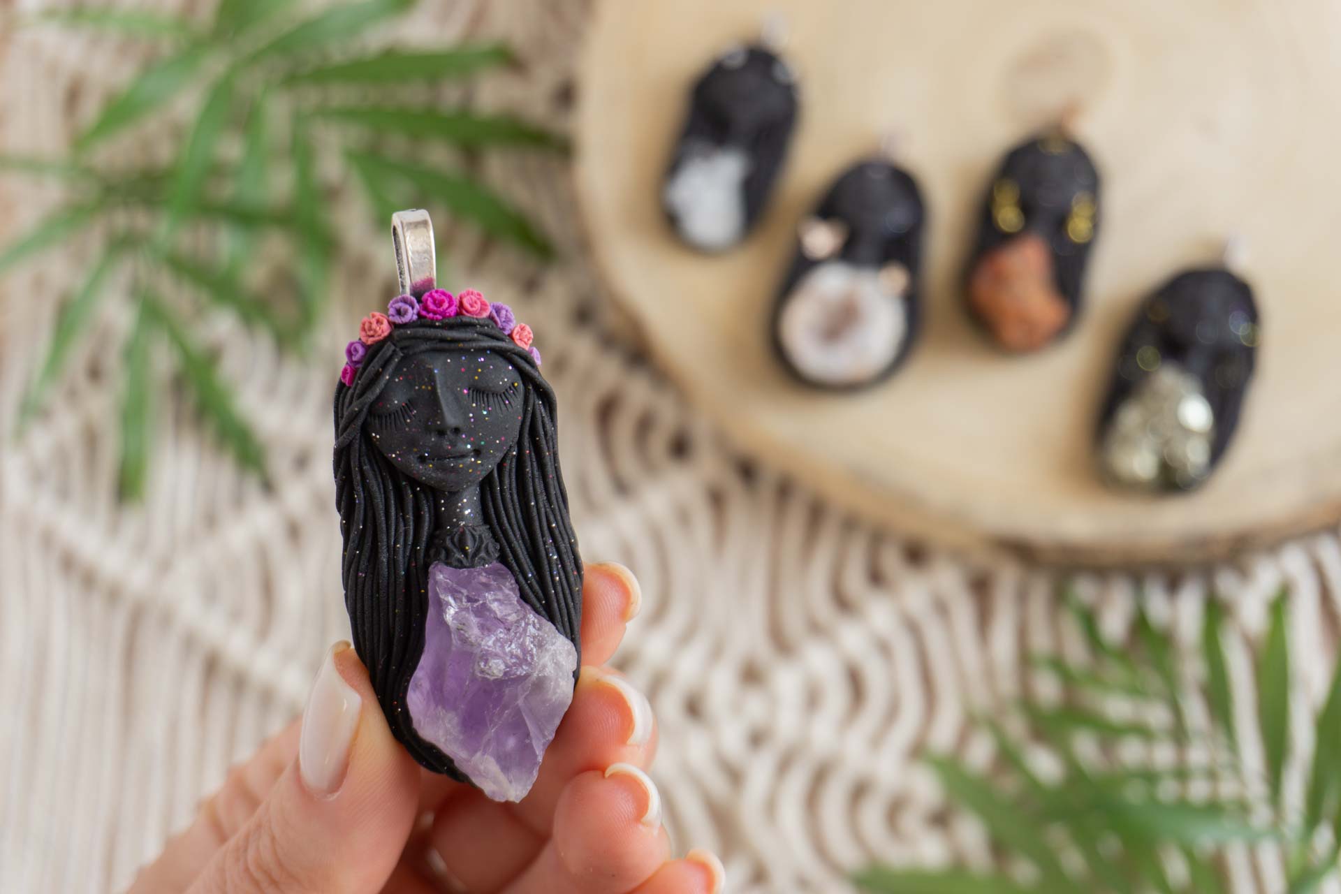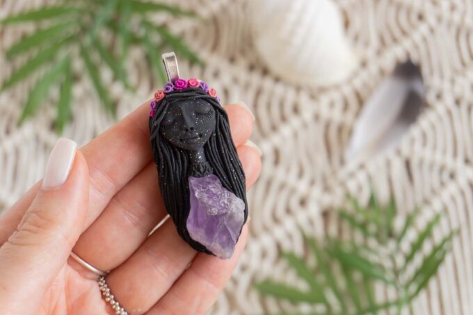 Vsaka Čarobnica je poimenovana po boginjah iz različnih obdobij, kultur in tradicij z vseh koncev sveta. Med izdelavo za vsako Čarobnico posebej povlečem orakelsko karto, ki nosi posebno sporočilo. Z vsako Čarobnico dobite torej še sporočilo, ki ga odkrijete šele, ko odprete paketek.