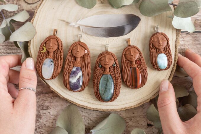 Vsaka Čarobnica je poimenovana po boginjah iz različnih obdobij, kultur in tradicij z vseh koncev sveta. Med izdelavo za vsako Čarobnico posebej povlečem orakelsko karto, ki nosi posebno sporočilo. Z vsako Čarobnico dobite torej še sporočilo, ki ga odkrijete šele, ko odprete paketek.