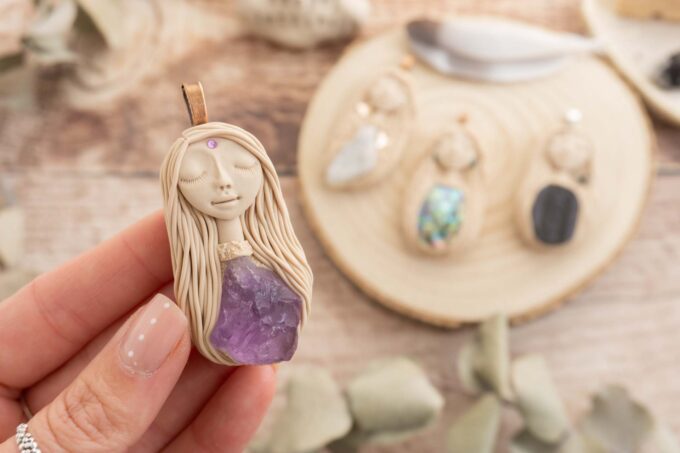 Vsaka Čarobnica je poimenovana po boginjah iz različnih obdobij, kultur in tradicij z vseh koncev sveta. Med izdelavo za vsako Čarobnico posebej povlečem orakelsko karto, ki nosi posebno sporočilo. Z vsako Čarobnico dobite torej še sporočilo, ki ga odkrijete šele, ko odprete paketek.