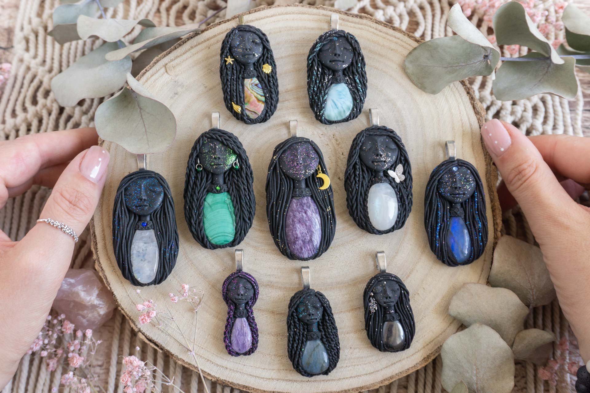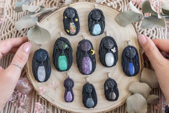 Vsaka Čarobnica je poimenovana po boginjah iz različnih obdobij, kultur in tradicij z vseh koncev sveta. Med izdelavo za vsako Čarobnico posebej povlečem orakelsko karto, ki nosi posebno sporočilo. Z vsako Čarobnico dobite torej še sporočilo, ki ga odkrijete šele, ko odprete paketek.