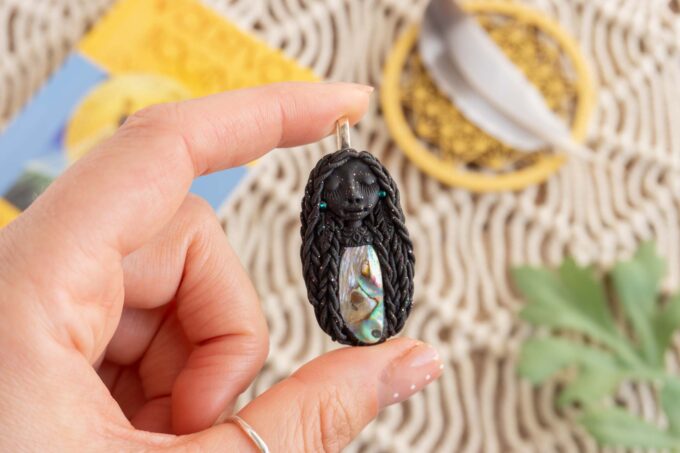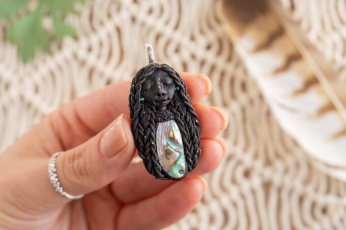 Čarobnica je izdelana iz polimerne gline. Vsak kos je unikaten in na voljo samo en kos. Izdelek lahko minimalno odstopa v barvnih niansah in detajlih, vendar se trudim, da bo vaš izdelek v naravi identičen opisu in fotografiji.
