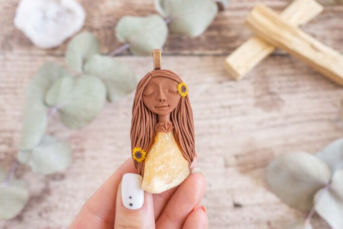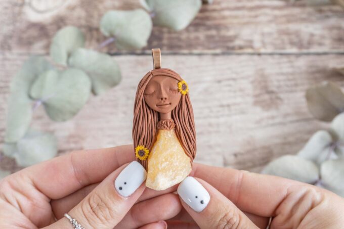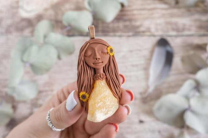 Čarobnica je izdelana iz polimerne gline. Vsak kos je unikaten in na voljo samo en kos. Izdelek lahko minimalno odstopa v barvnih niansah in detajlih, vendar se trudim, da bo vaš izdelek v naravi identičen opisu in fotografiji.