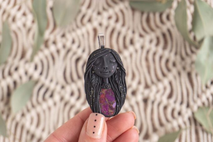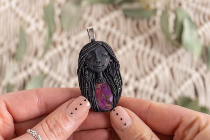 Čarobnica je izdelana iz polimerne gline. Vsak kos je unikaten in na voljo samo en kos. Izdelek lahko minimalno odstopa v barvnih niansah in detajlih, vendar se trudim, da bo vaš izdelek v naravi identičen opisu in fotografiji.