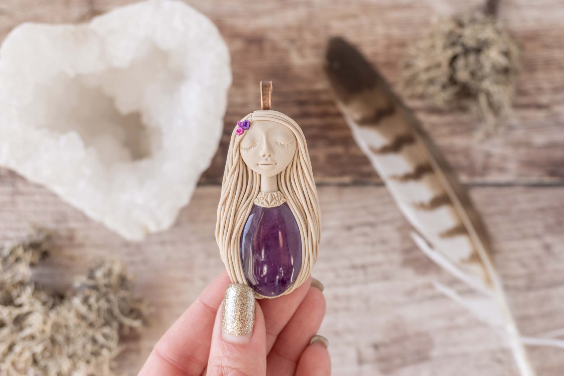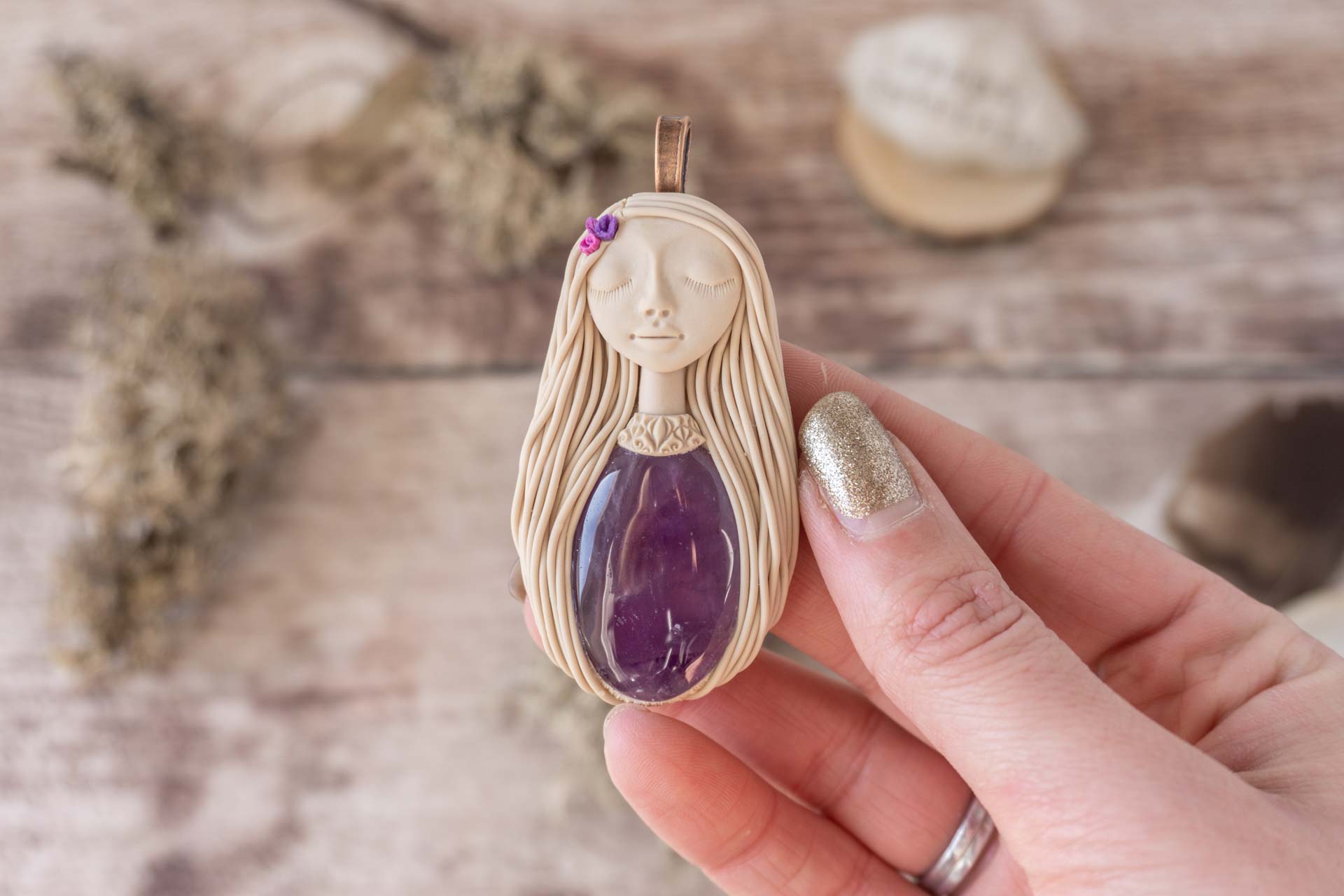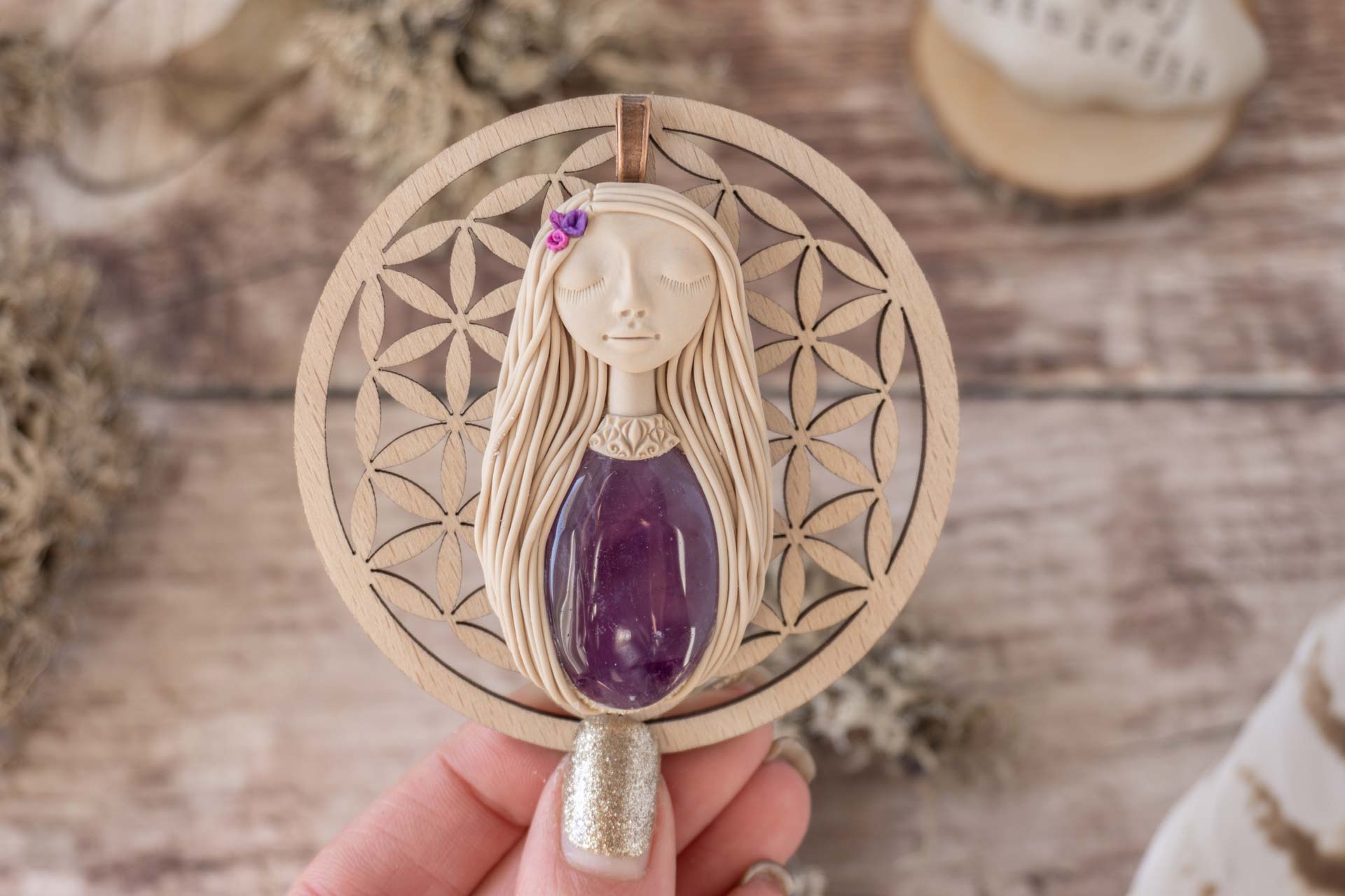 Čarobnica je izdelana iz polimerne gline. Vsak kos je unikaten in na voljo samo en kos. Izdelek lahko minimalno odstopa v barvnih niansah in detajlih, vendar se trudim, da bo vaš izdelek v naravi identičen opisu in fotografiji.