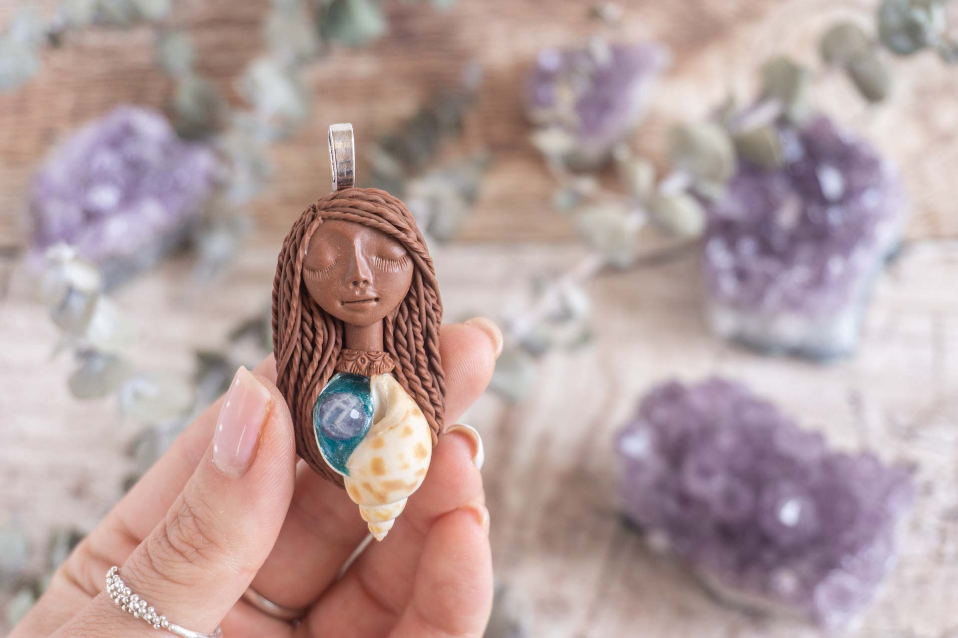 Vsebuje školjko in kroglico ametist: