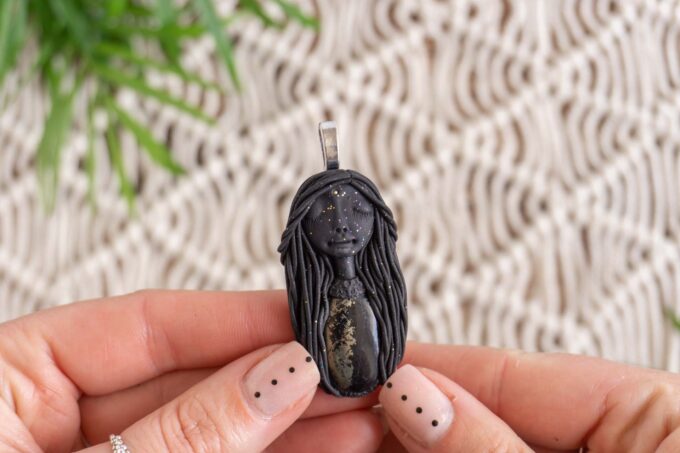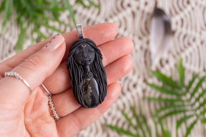 Čarobnica je izdelana iz polimerne gline. Vsak kos je unikaten in na voljo samo en kos. Izdelek lahko minimalno odstopa v barvnih niansah in detajlih, vendar se trudim, da bo vaš izdelek v naravi identičen opisu in fotografiji.