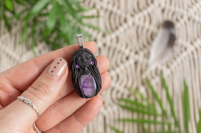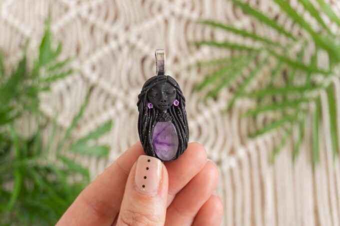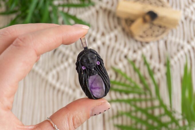 Čarobnica je izdelana iz polimerne gline. Vsak kos je unikaten in na voljo samo en kos. Izdelek lahko minimalno odstopa v barvnih niansah in detajlih, vendar se trudim, da bo vaš izdelek v naravi identičen opisu in fotografiji.