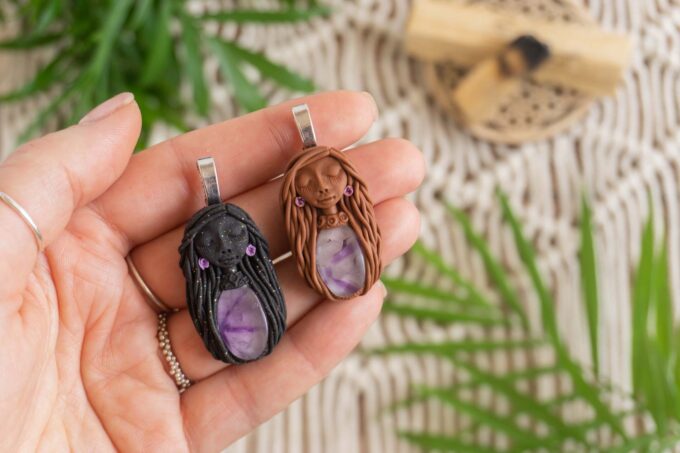 Vsaka Čarobnica je poimenovana po boginjah iz različnih obdobij, kultur in tradicij z vseh koncev sveta. Med izdelavo za vsako Čarobnico posebej povlečem orakelsko karto, ki nosi posebno sporočilo. Z vsako Čarobnico dobite torej še sporočilo, ki ga odkrijete šele, ko odprete paketek.
