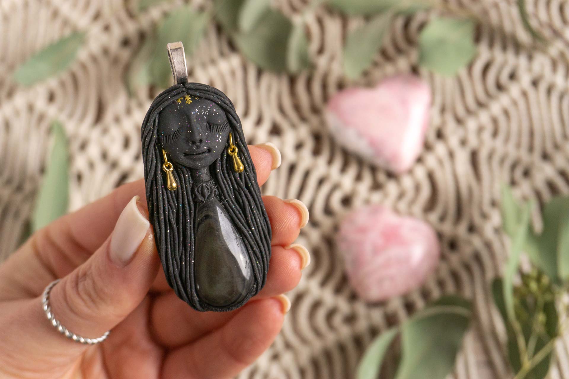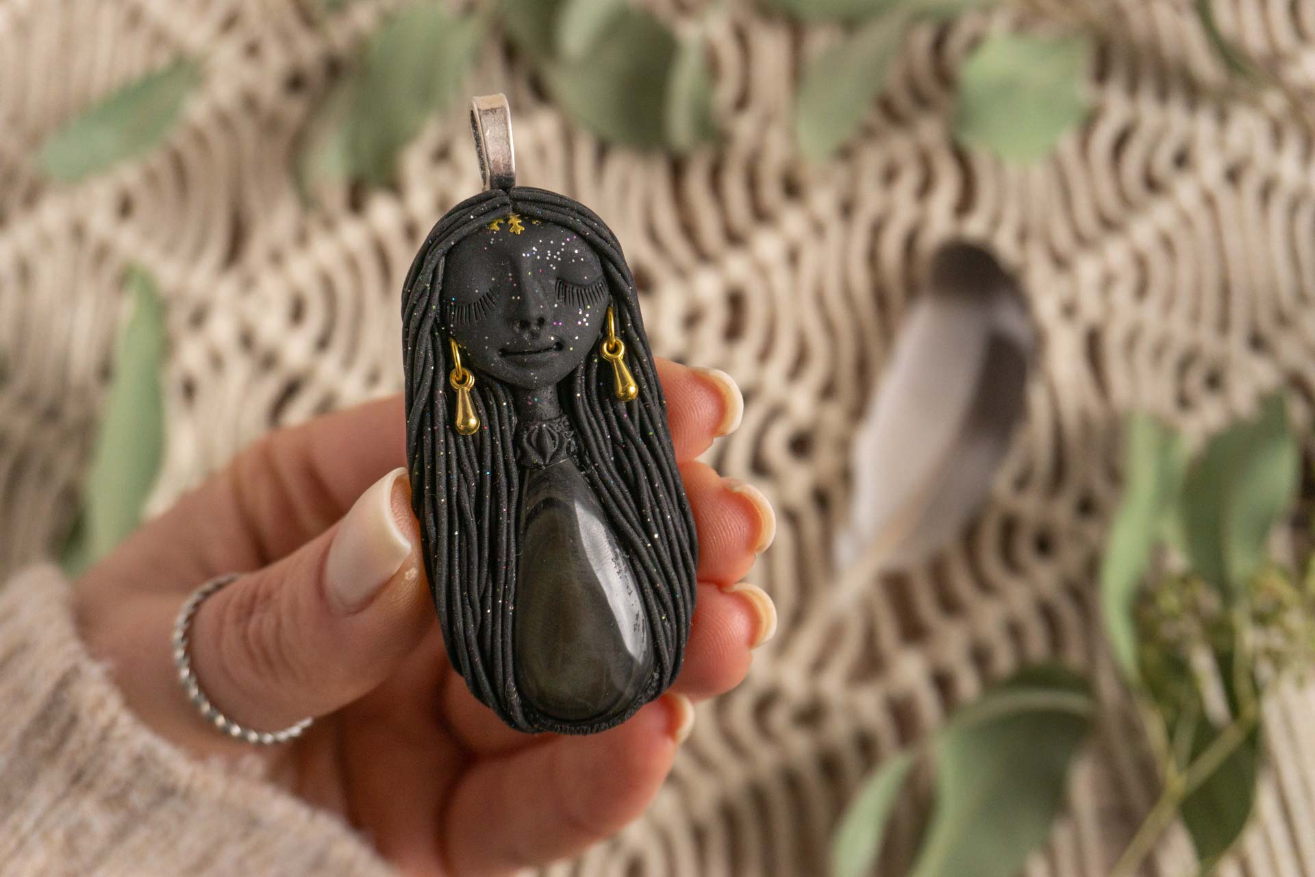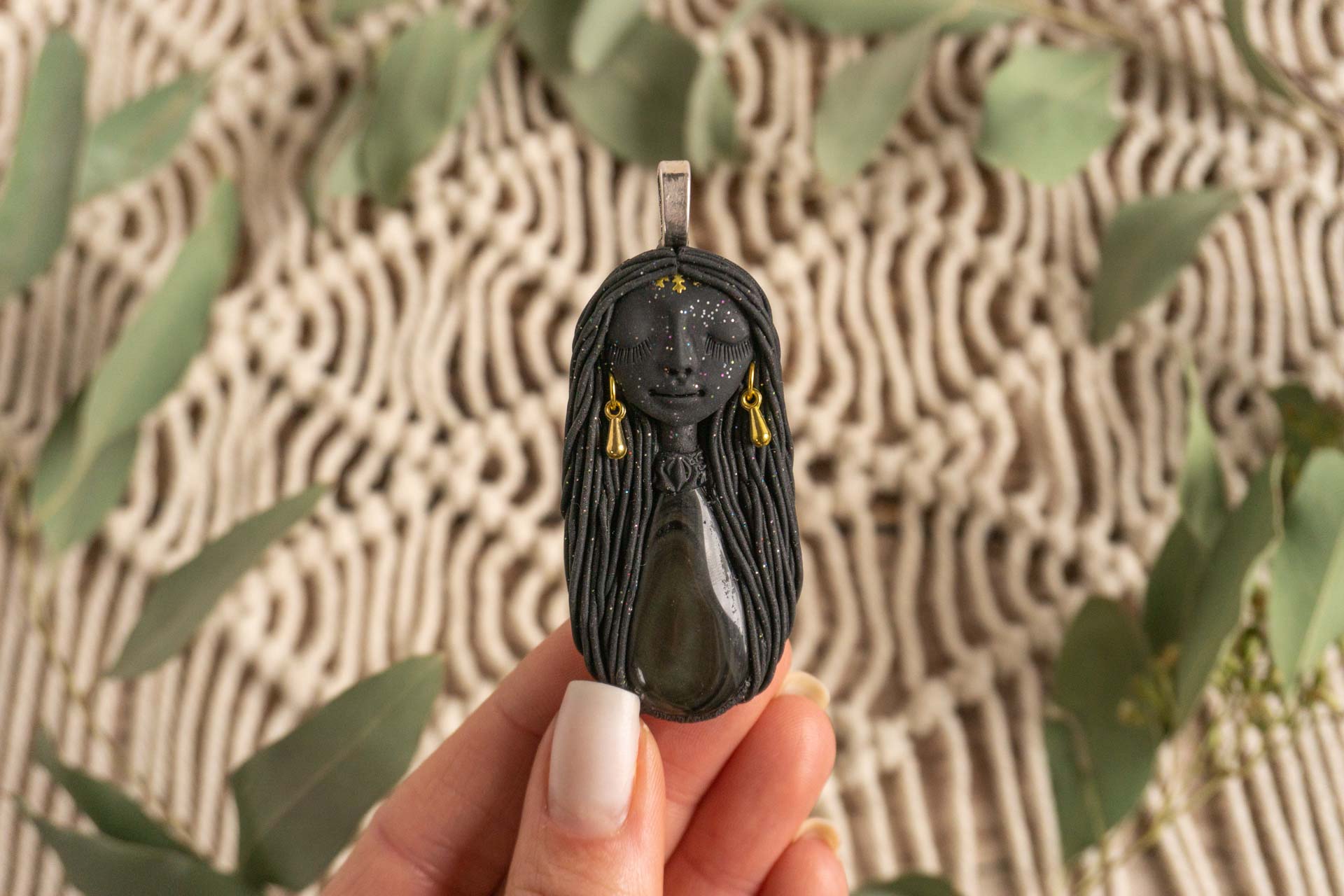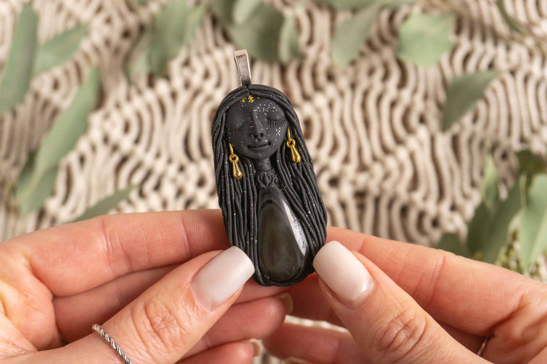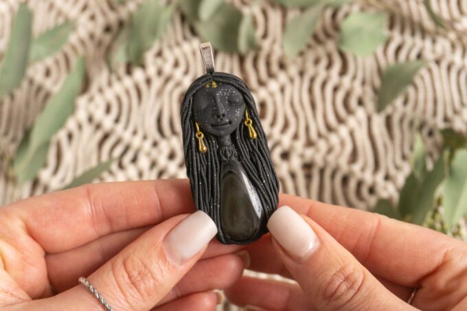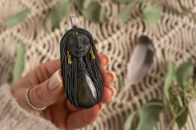 Čarobnica je izdelana iz polimerne gline. Vsak kos je unikaten in na voljo samo en kos. Izdelek lahko minimalno odstopa v barvnih niansah in detajlih, vendar se trudim, da bo vaš izdelek v naravi identičen opisu in fotografiji.