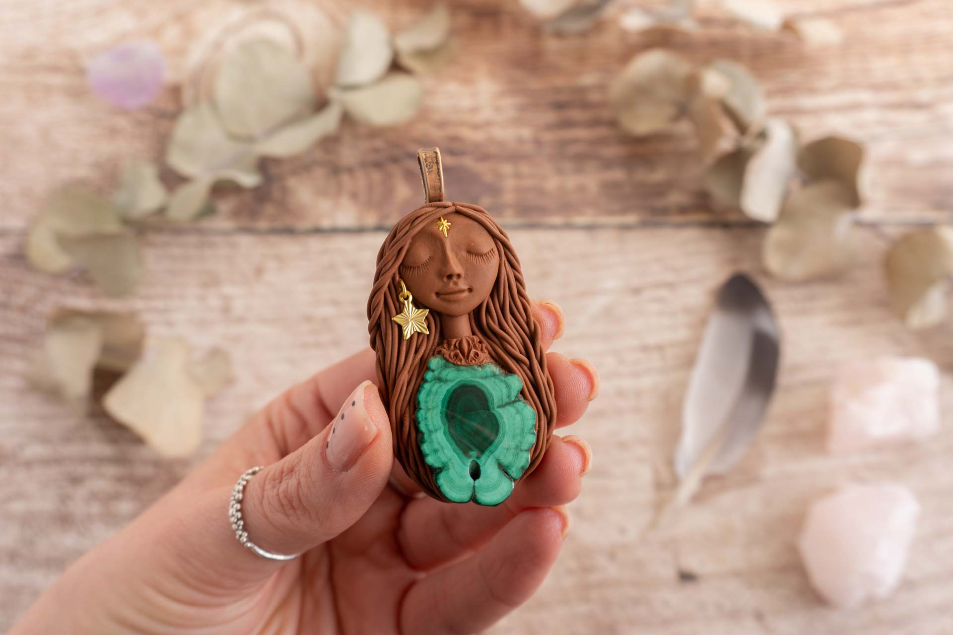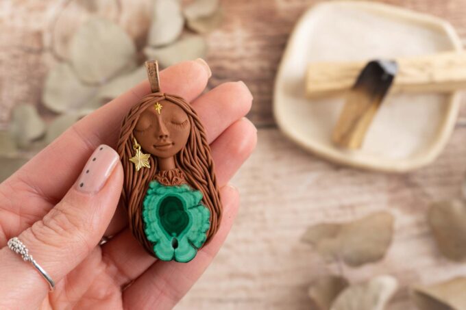 Vsaka Čarobnica je poimenovana po boginjah iz različnih obdobij, kultur in tradicij z vseh koncev sveta. Med izdelavo za vsako Čarobnico posebej povlečem orakelsko karto, ki nosi posebno sporočilo. Z vsako Čarobnico dobite torej še sporočilo, ki ga odkrijete šele, ko odprete paketek.