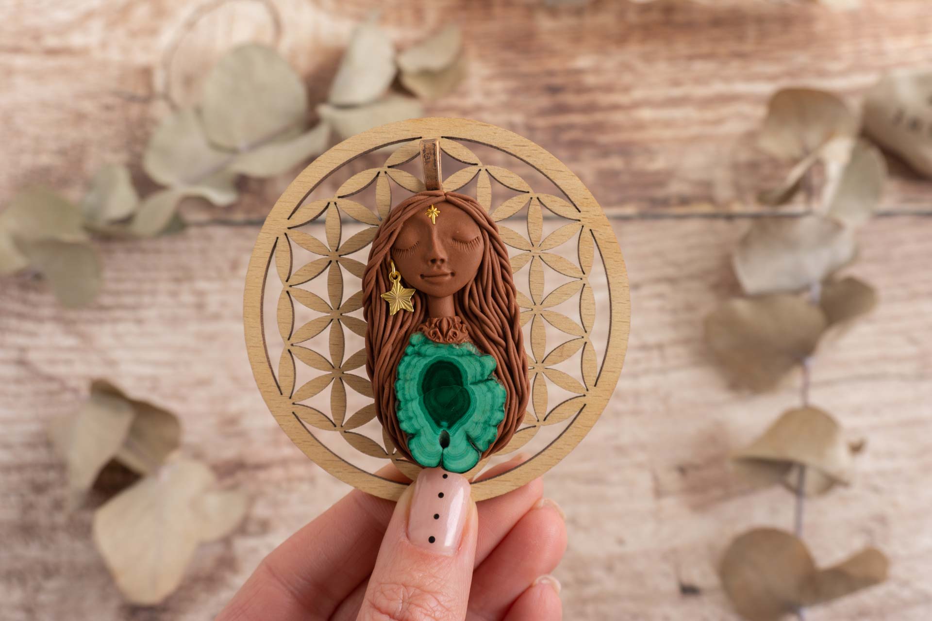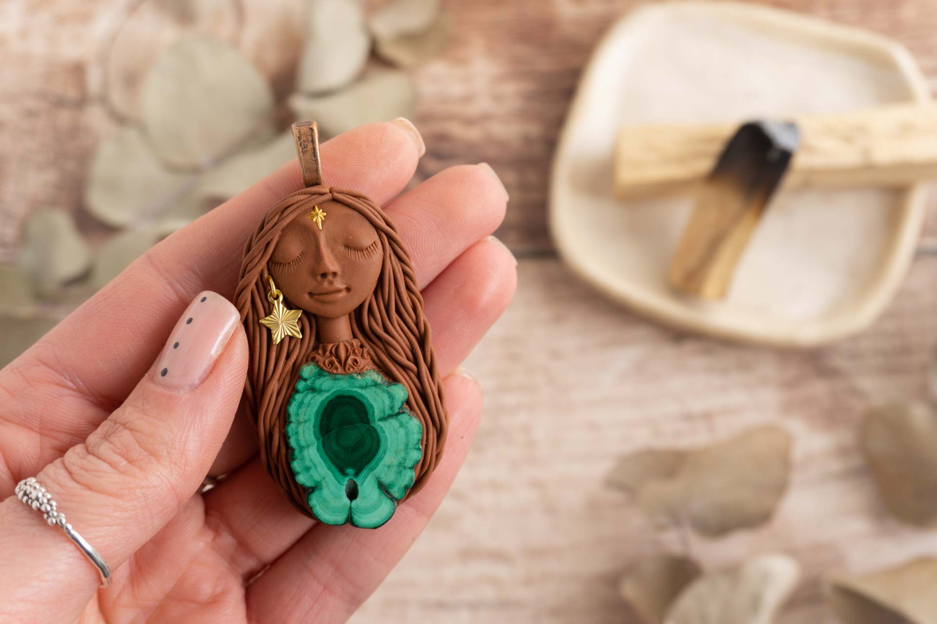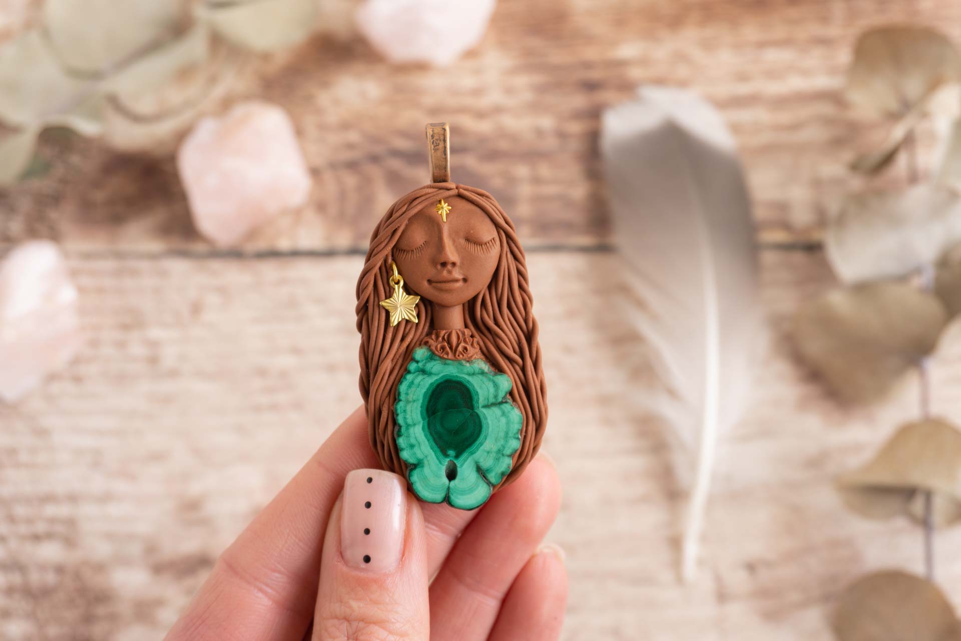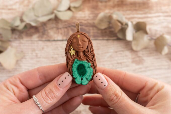 Čarobnica je izdelana iz polimerne gline. Vsak kos je unikaten in na voljo samo en kos. Izdelek lahko minimalno odstopa v barvnih niansah in detajlih, vendar se trudim, da bo vaš izdelek v naravi identičen opisu in fotografiji.