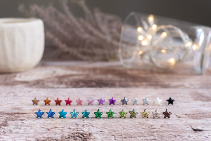 Mavrično temno modra, Temno modra, Mavrično turkizna, Svetlo modra, Turkizna, Temno zelena, Zelena, Svetlo zelena, Zeleno oranžna, Zlata, Zlato srebrna, Rjava, Oranžno zelena, Oranžna, Rdeča, Ciklamno roza, Roza, Svetlo roza, Mavrično roza, Vijolična, Temno srebrna, Srebrna, Mavrično srebrna, Bela, Črna