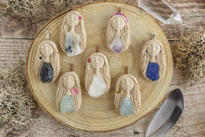 Vsaka Čarobnica je poimenovana po boginjah iz različnih obdobij, kultur in tradicij z vseh koncev sveta. Med izdelavo za vsako Čarobnico posebej povlečem orakelsko karto, ki nosi posebno sporočilo. Z vsako Čarobnico dobite torej še sporočilo, ki ga odkrijete šele, ko odprete paketek.