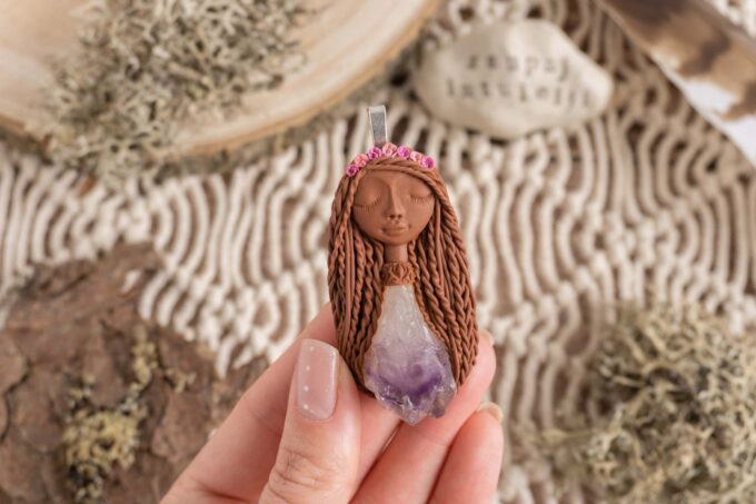 Čarobnica je izdelana iz polimerne gline. Vsak kos je unikaten in na voljo samo en kos. Izdelek lahko minimalno odstopa v barvnih niansah in detajlih, vendar se trudim, da bo vaš izdelek v naravi identičen opisu in fotografiji.